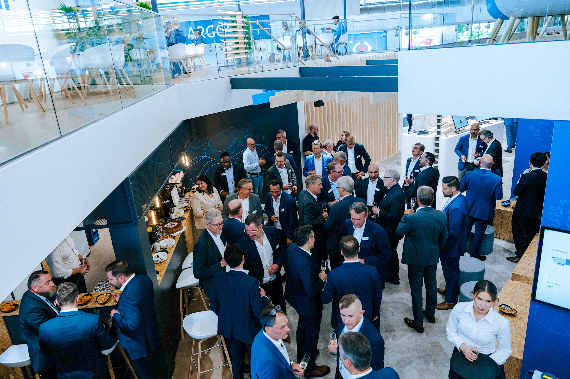 The monumental island booth, a two-story structure covering 772 sqm, was both open and inviting. Smart visitor guidance through zoning is a must given the many thematic areas. We created separate spaces for presentations, meetings, and product demonstrations. The hospitality area on the upper floor provides a retreat for in-depth discussions.